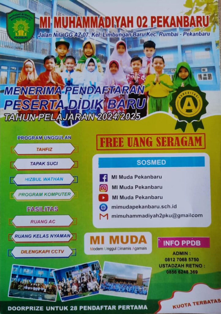 Ayah dan bunda. MI Muhammadiyah 02 Pekanbaru telah membuka Penerimaan Peserta Didik Baru Tahun Pelajaran 2024/2025. Kami menyediakan fasilitas terbaik untuk anak ayah dan bunda demi kenyamanan mereka belajar di MI Muhammadiyah 02 Pekanbaru.